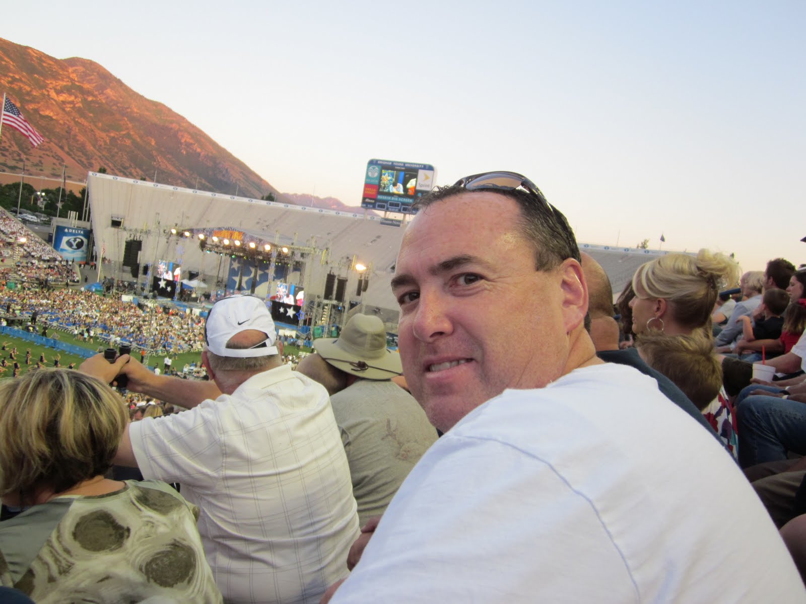 The temperature almost hit 100 during the day. We were thrilled to find that our tickets were on the west side of Lavel Edwards Stadium. We almost felt bad for the people who arrived early and had to sit in the hot sun for a couple of hours before the sun went down. Tyson going old school with the rabbit ears to mom's head.